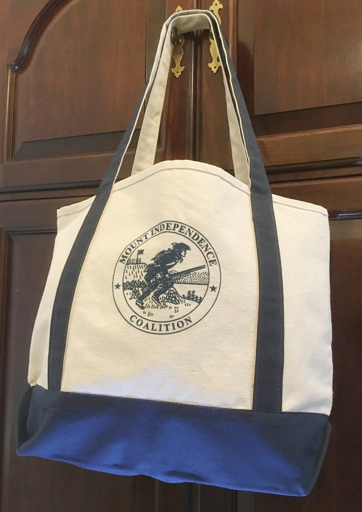 This 12 ounce canvas tote has sporty navy blue accents, matching the imprinted Mount Independence Coalition logo. The gusseted bottom opens to six inches, making the tote practical for all sorts of purposes.
